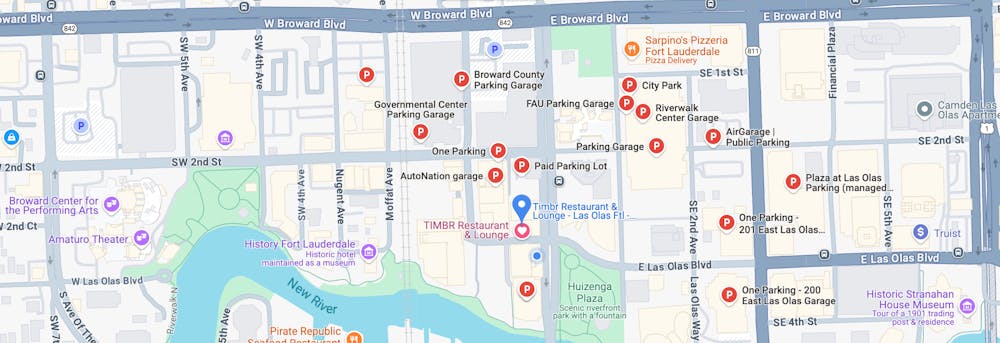 TIMBR is located at 15 West Las Olas Blvd, across the street from The Wharf, and a half a block west of Andrews Ave and the Museum of Art.